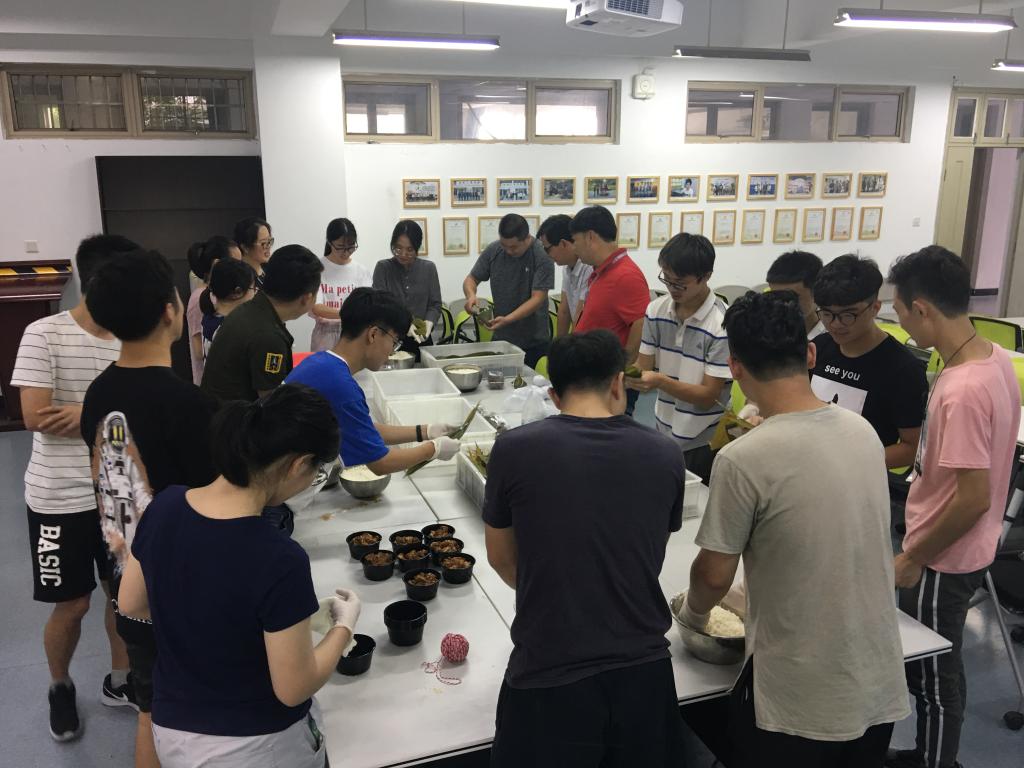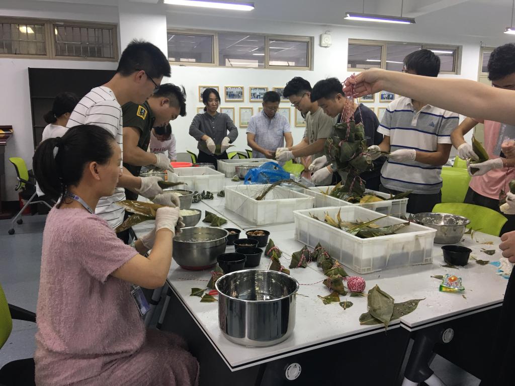 老师和同学们开展教学、科研工作是专家能手,但面对一盆盆糯米、粽叶、五花肉、蜜枣、蛋黄等原料,想要包出像样的粽子却非易事。活动现场,工会特邀王晓倩老师进行现场教学。师生们在她的指导下,将两条粽叶平摊在手掌中,折成锥形,在其中加几勺米,再放入猪肉或蜜枣,裹紧、绕绳、打结……,大家都开心地包出了自己的粽子。很多老师和同学都表示,“粽子经常吃,但从未自己动手包过,参加这样的师生活动,既丰富了业余生活,增进了师生情谊,还增强了自己的生活能力,非常开心”。