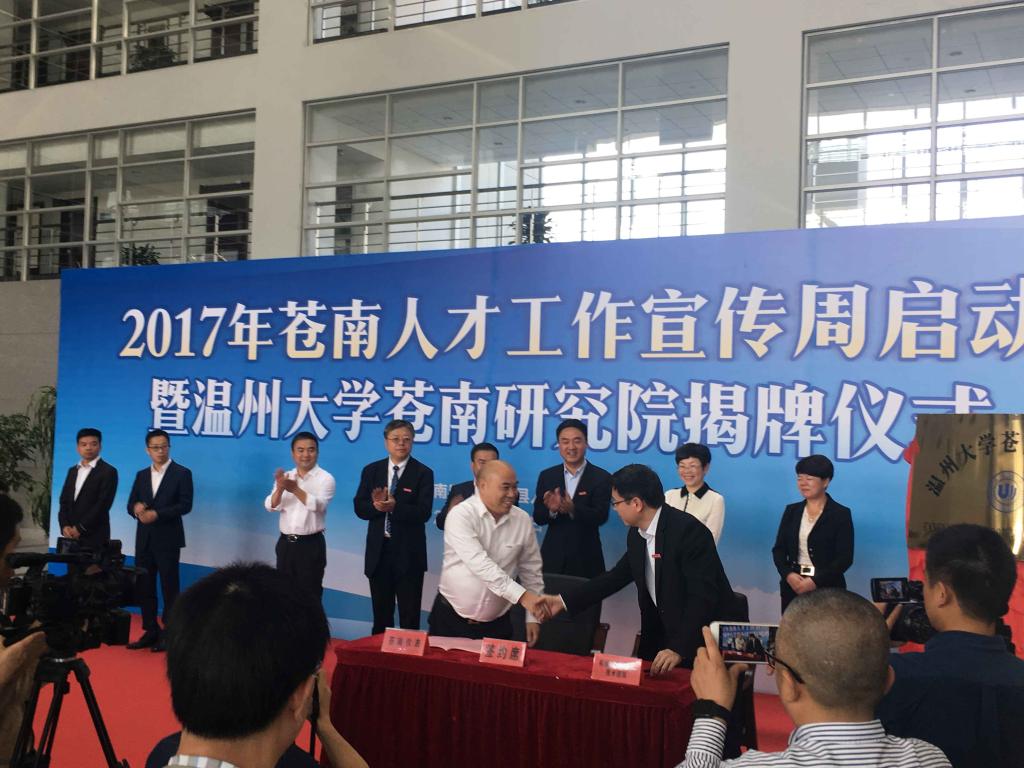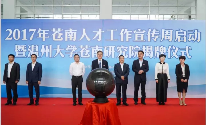 2017年11月3日下午,温州大学苍南研究院揭牌仪式在苍南县行政中心举行,这是我校与苍南县开展校地合作的一个重要里程牌,也标志着温州大学苍南研究院工作将全面启动。校长李校堃,副校长钱强,市委组织部副部长胡永锋,苍南县委书记黄荣定,县委常委、组织部长李青,副县长徐顺和、曾迎玲以及双方有关部门负责人、部分企业家代表参加了揭牌仪式。苍南县委副书记胡长虹主持仪式。
