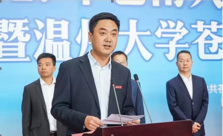 副校长、温州大学苍南研究院院长钱强致辞。钱强强调,学校将大力支持研究院的建设与发展,相信研究院一定能够以提高人才培养质量为核心,以深化产教融合、校企合作为重点,以温大学科与专业优势为依托,为区域产业转型升级培育出更多具有创新创业精神和能力的高素质应用型人才,为苍南和温州经济社会发展注入新动能。