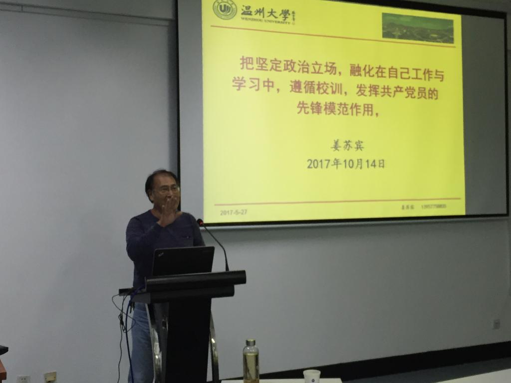 加拿大28预测 退休老领导姜苏宾老师为全体党员和入党积极分子作了《把坚定政治立场融化在自己工作与学习中,遵循校训,发挥党员的先锋模范作用》的报告,姜苏宾老师通过叙说加拿大28预测 的建立初期的艰苦过程,将“不忘初心”的含义讲解得淋漓尽致,告诫研究生党员要增强党员意识,并提出要提高学习能力、加强党性修养、继续学习党章的三项要求,做一个合格党员。