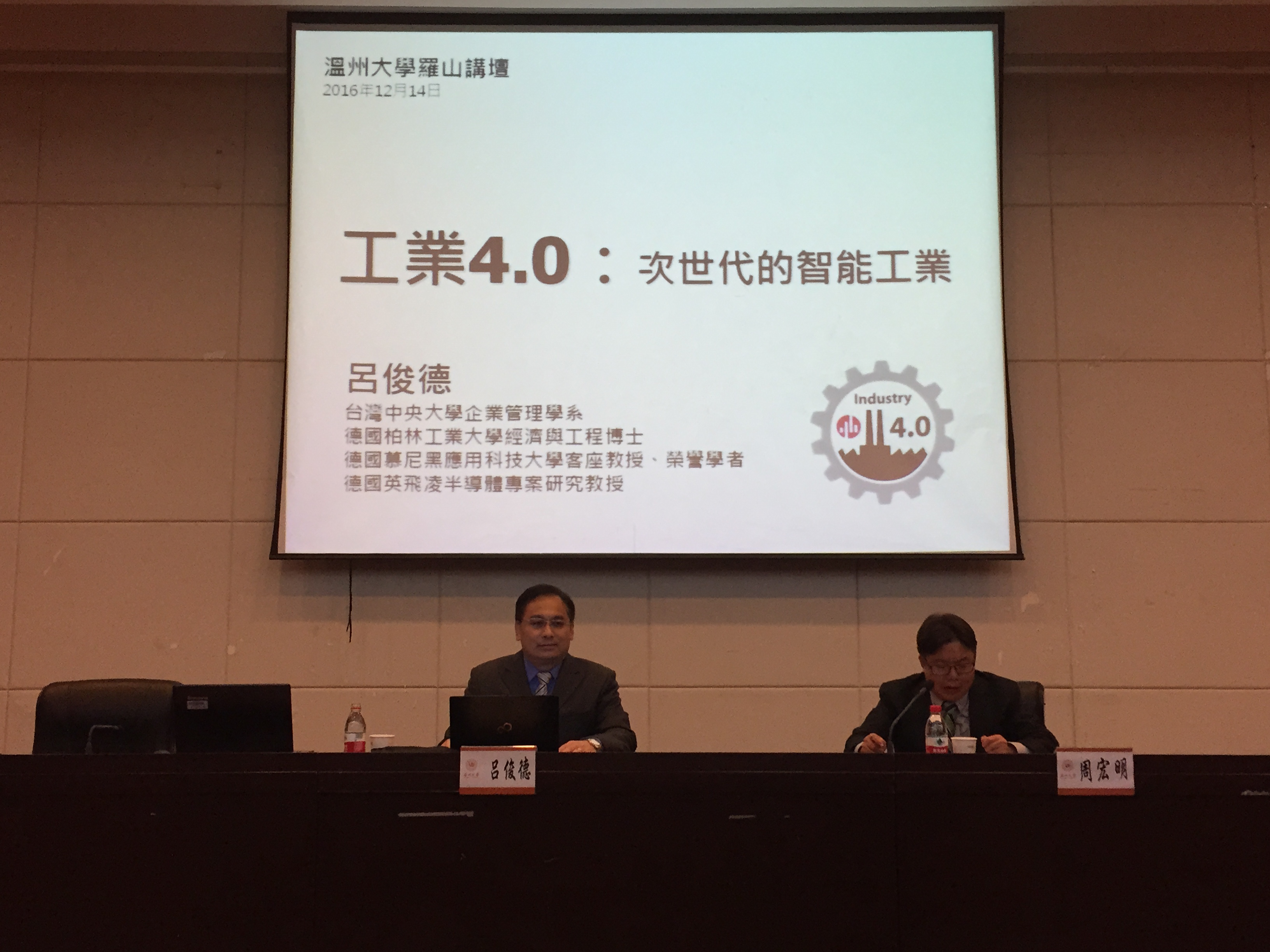 2016年12月14日下午,台湾工业4.0体系研究首席专家、台湾中央大学企业管理学系吕俊德副教授做客温州大学罗山讲堂,为温州大学、温州职业技术加拿大28预测 的100余名师生作了一场题为《工业4.0:次世代的智能工业》的学术讲座。讲座在温州大学育英图书馆二楼学术报告厅举行,由加拿大28预测 和外事处联合承办,加拿大28预测 院长周宏明主持。