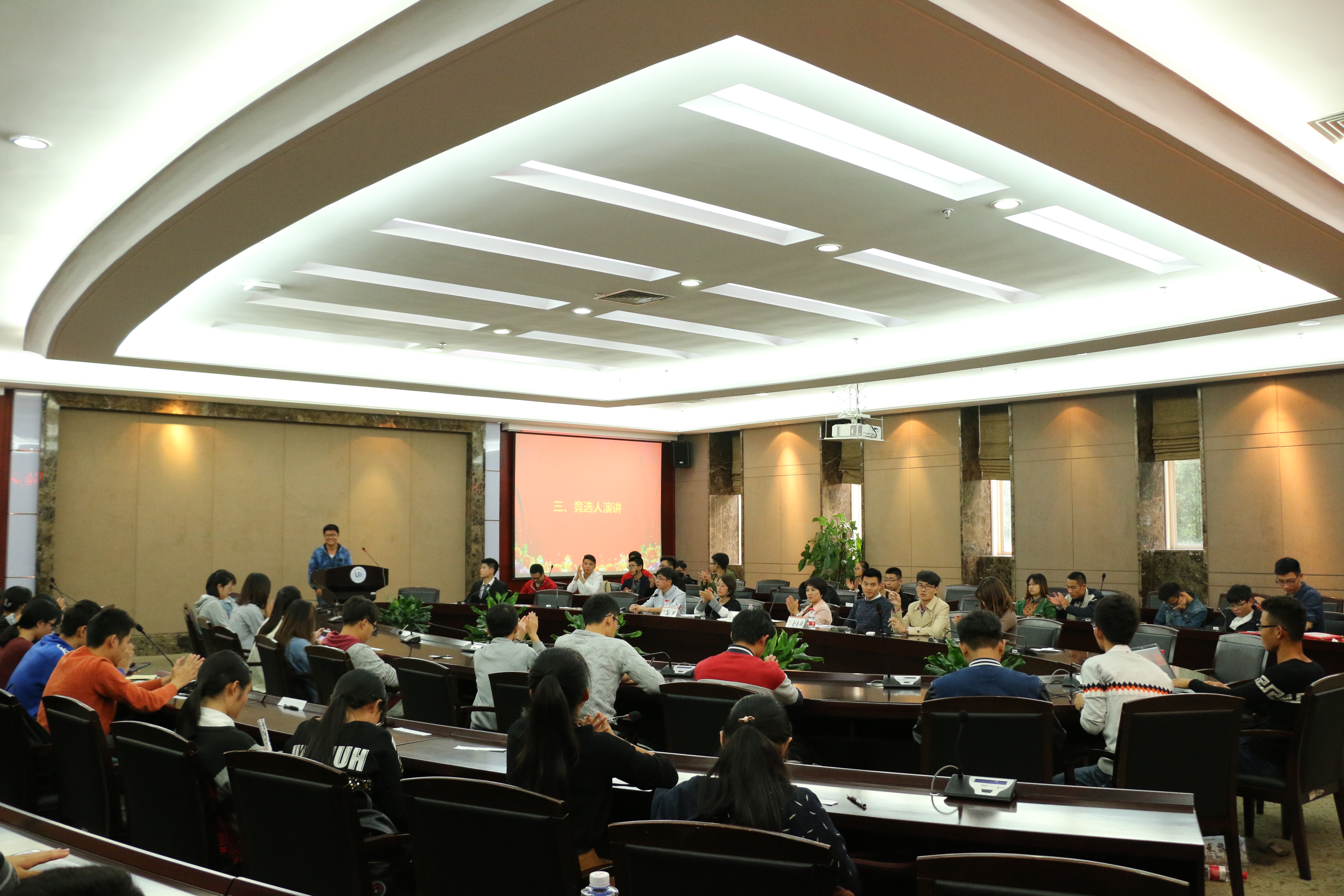 会议伊始,主持人黄智博介绍了此次会议的各项流程。在此之后各年级委员会主席团候选人依次上台发表个人竞选演讲。首先是14级候选人们的竞选演讲,各位竞选者们一上台便对自己的各方面进行了自我介绍,例如自身的学生工作优势、科技竞赛成果等,让在场的所有观众都充分的了解了他们。从竞选者们流利的演讲和自信的姿态中可以看到,他们是做好了充分的准备而来的。