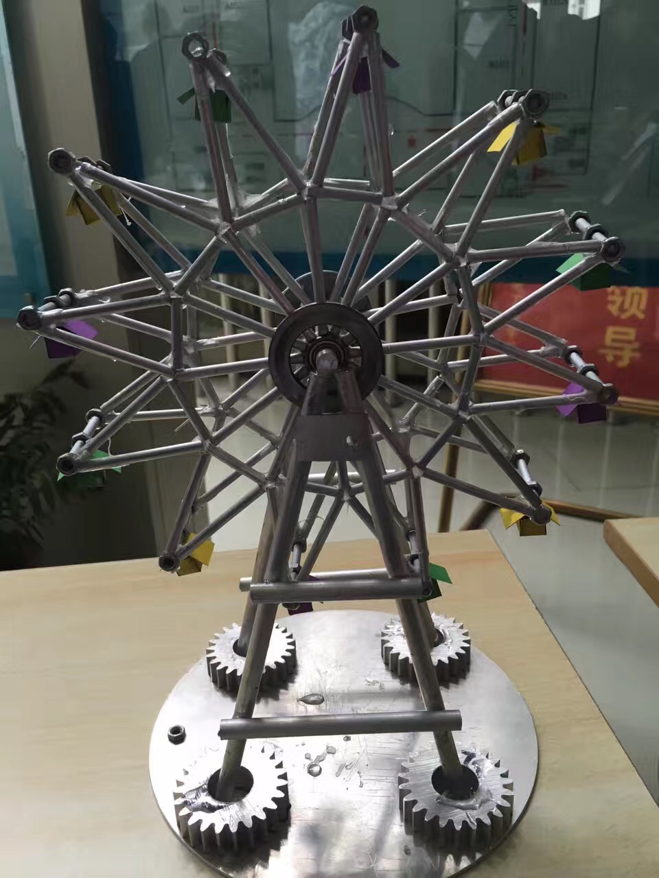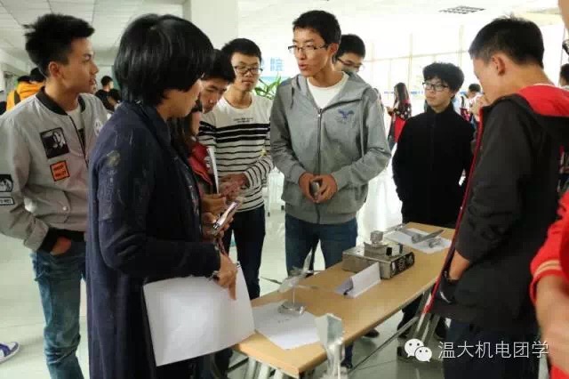 此次比赛旨在为各位机械爱好者提供一个相互交流相互学习的机会,加强学生对机械专业的了解。比赛的现场人数众多,除了参赛选手之外,前来观摩的有老师还有15、14届的学生。各位队员将自己的作品摆好之后展开了激烈的交流,各队之间互相观赏作品,每个作品都充满了创意,令人眼花缭乱。现场各位参赛选手交流之中思维的碰撞,将现场的气氛推向了高潮,在他们之间即将展开激烈的竞争。然而评分老师的到来将现场气氛推向了顶峰。两位评分老师到来之后立刻投入了作品打分工作,评分老师通过制作人的描述和实物造型为每个作品打出了合理的分数。