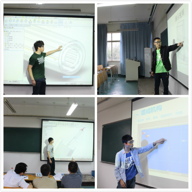 整个比赛要求每组选手上台进行三维模型的展示,然后再进行答辩。本次题目为制作一个可以把尺寸不同的球快速分类的作品。大部分作品是设计不同尺寸的圆孔或是不同间隙的木条进行分类,也有个别选手设计出了创新性高的轨道。面对评委老师问题与评价,有的思索片刻;有的面色从容,口若悬河,其精妙想法引得老师频频点头。随着生动形象的三维仿真图在投影仪上展现各自的风采,比赛渐渐接近了尾声,当最后一位选手在热烈的掌声中走下讲台,比赛也由此落下帷幕。