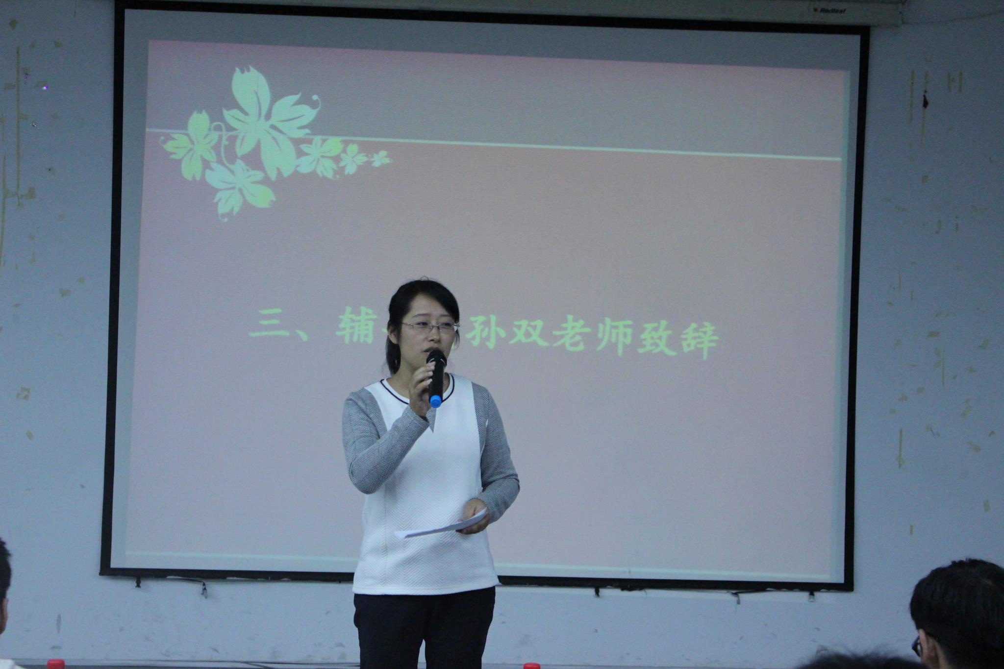 首项议程,全体起立唱团歌。之后,孙双老师致开班典礼辞,她首先向新加入的团学成员表示热烈的欢迎,并希望在接下来的活动中,各位团学干部能够在传承中不断创新;具有奉献精神和大局意识;不断传递正能量;要夯实在班级工作中的根基。话音刚落,便赢得同学们热烈的掌声。