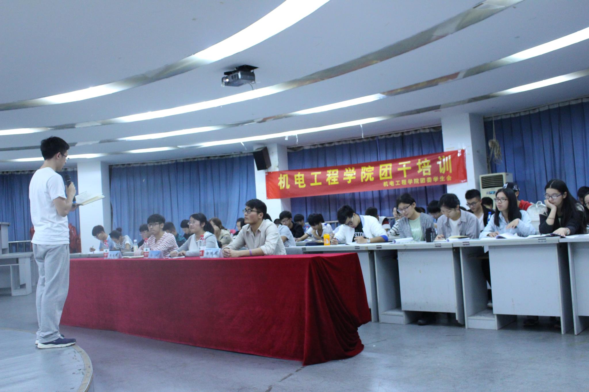 接下来会议正式进入了团干培训第一节课内容,团委副书记徐顺锋做主题讲座。他对以往的工作进行了总结并分享了自己的工作经验。团学干事认真听讲并做好笔记,积极发言配合,听取宝贵经验的同时,也对自己的大学生活有了新的认识和规划。相信每一位新干事都会记得徐顺蜂学长的教导,坚守本心,做最优秀的自己。在全体成员热烈的掌声中,本学年第一次团干培训圆满结束!