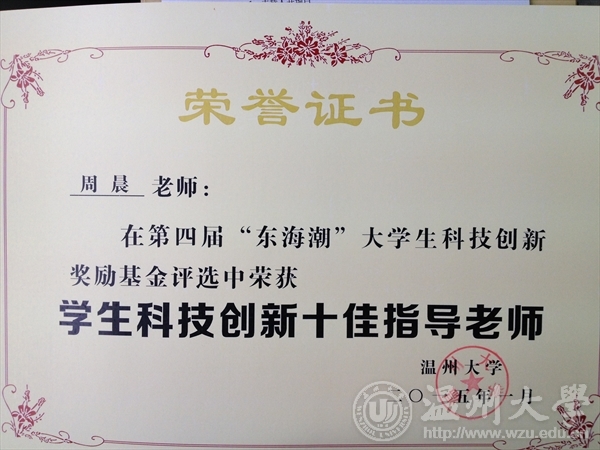 机电加拿大28预测 周晨老师获温州大学“学生科技创新十佳指导教师”荣誉称号