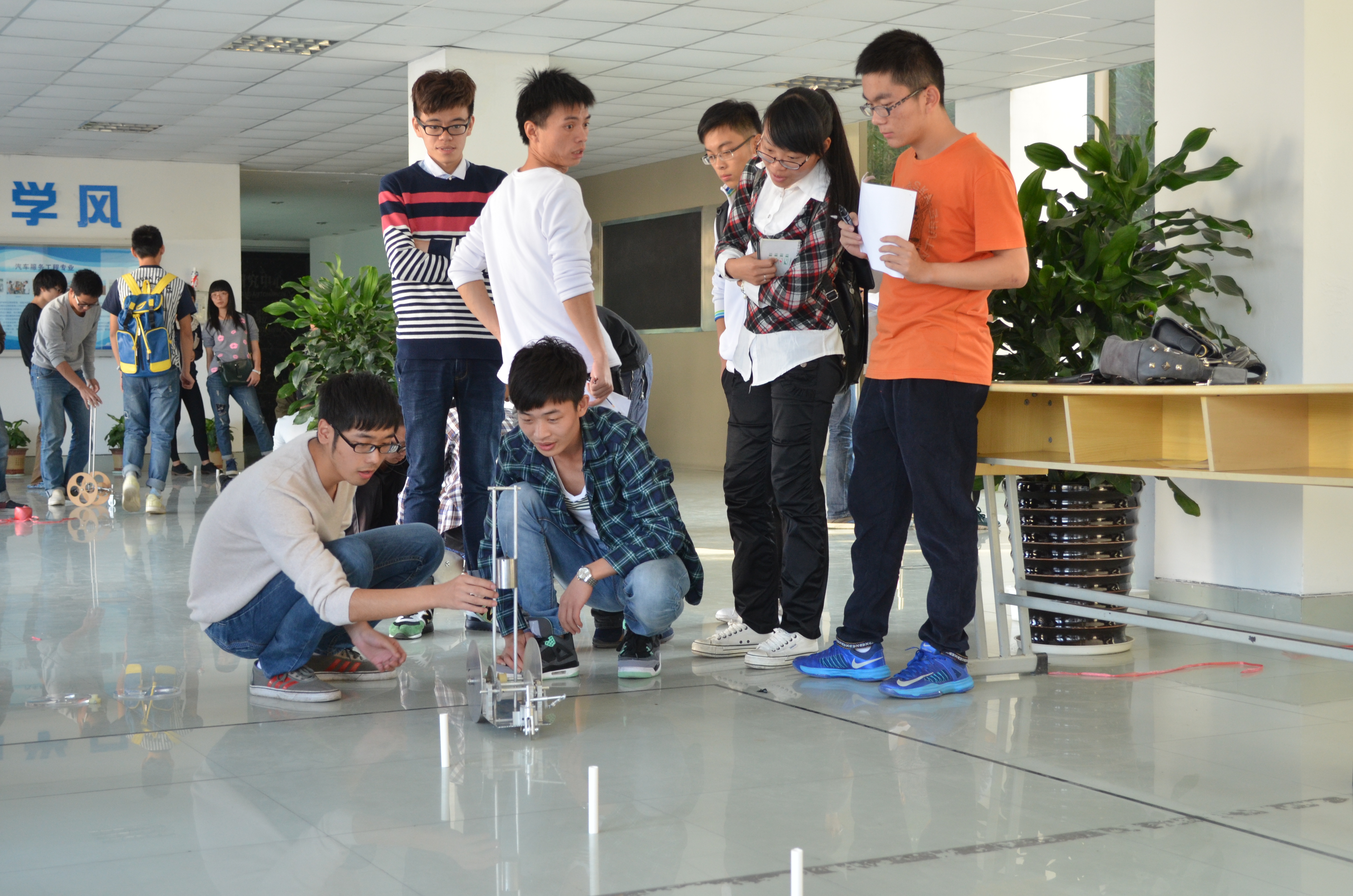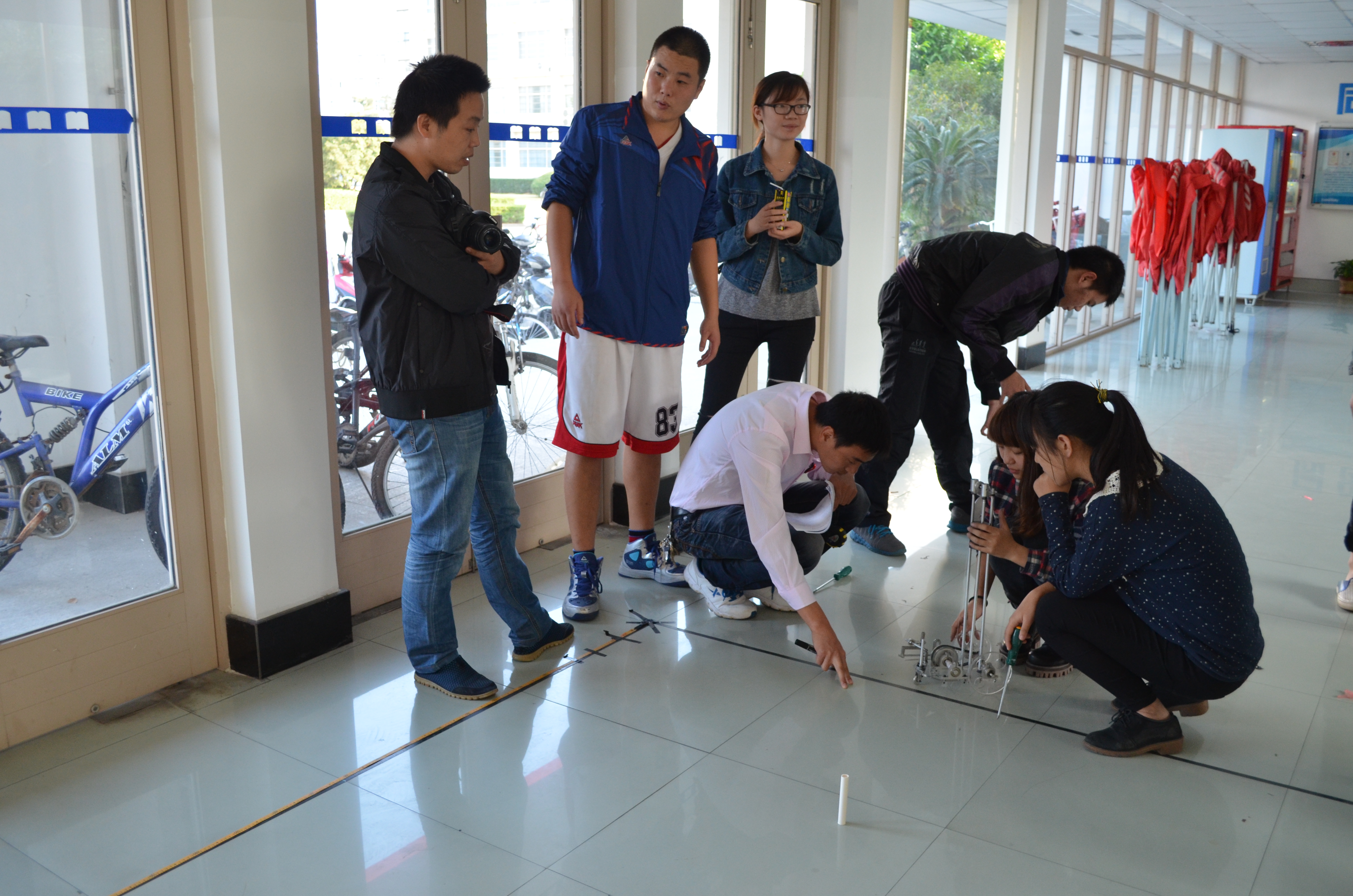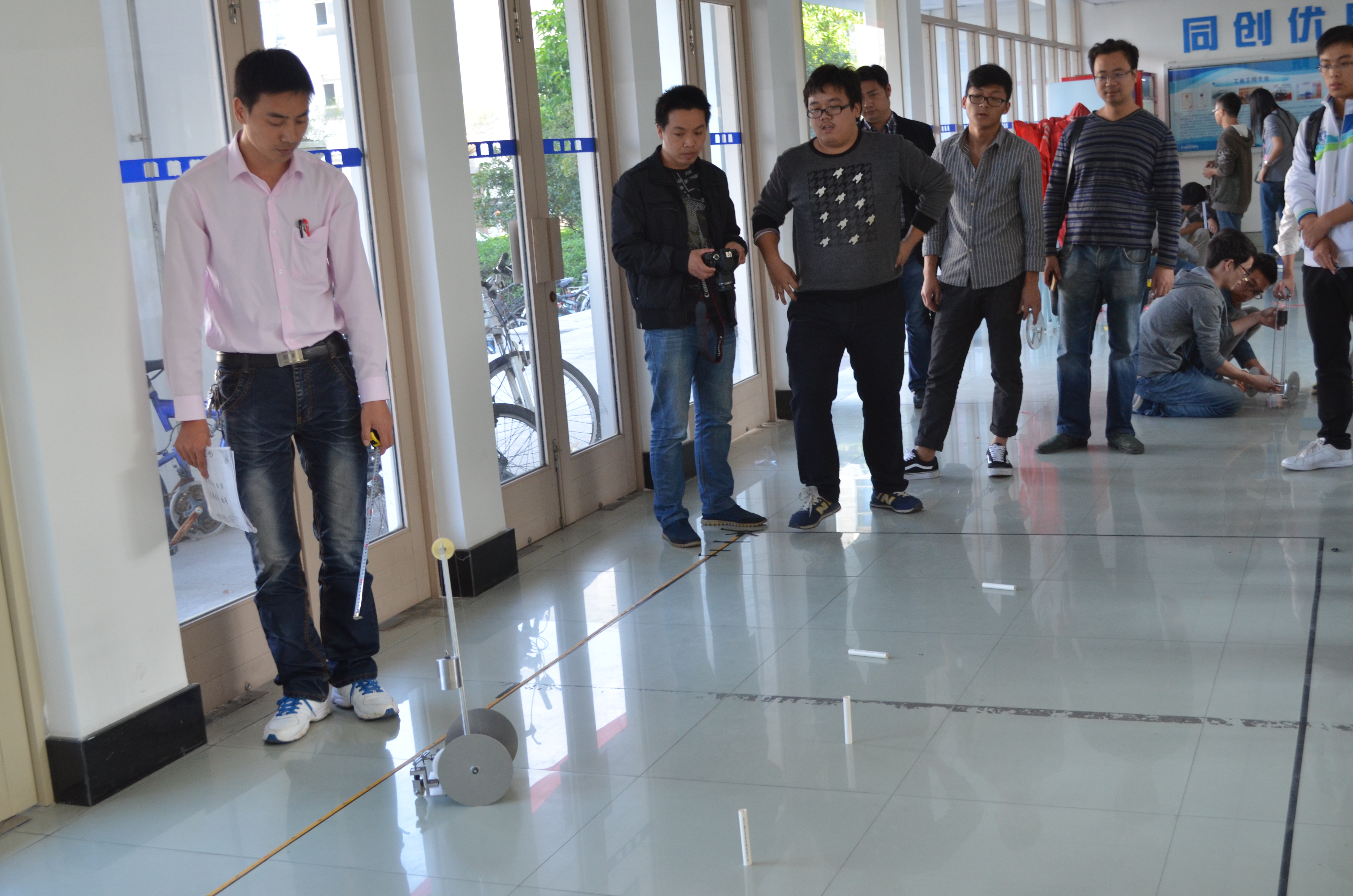 天气阳光明媚温度适宜,参赛选手也是热情高涨。此次比赛分绕8字型组和绕S型组,两组同时进行比赛。每组选手将前期制作好的无碳小车放置在赛道上运行。通过对小车运行的距离以及绕过障碍物的个数综合评定成绩。每组选手都有两次测试的机会,取成绩最好的一次为最后成绩。经过一段调式时间后,激动人心的时刻终于来了,绕S型组第一组选手登场。只见他自信的拿上他的小车摆在出发点,松开重物,小车缓缓向前驶去,只见小车接连过桩,有条不紊的走着,虽然不小心擦倒了几个桩,但依旧不能阻挡它前进的步伐,最后走完了全部的桩,为本次大赛开了个好头。比赛队伍一个接着一个纷纷登场,场地周围站满了同学,而比完参赛选手紧张的看着后面比的选手。后面比的选手摩拳擦掌,不断调试试验自己的小车,势有拿第一的气势。比赛过程中也有失败者,一些小车挂上重物后开不起来,一些小车虽然开了起来确实笔直向前,一些小车更是像无头苍蝇一样乱冲,真是别有乐趣。再看8字型组,8字型的难度是远高于S型的,参赛选手也相对较少,但8字看起来更具趣味。半张乒乓球台上竖着两个相距30厘米的桩,小车要以它们来绕8,听上去就特别有挑战性。最厉害的要数一辆轮子一大一小的小车,其貌不扬,但硬是绕了好几个8字。周围看的同学也是惊呼不已,掌声不断。