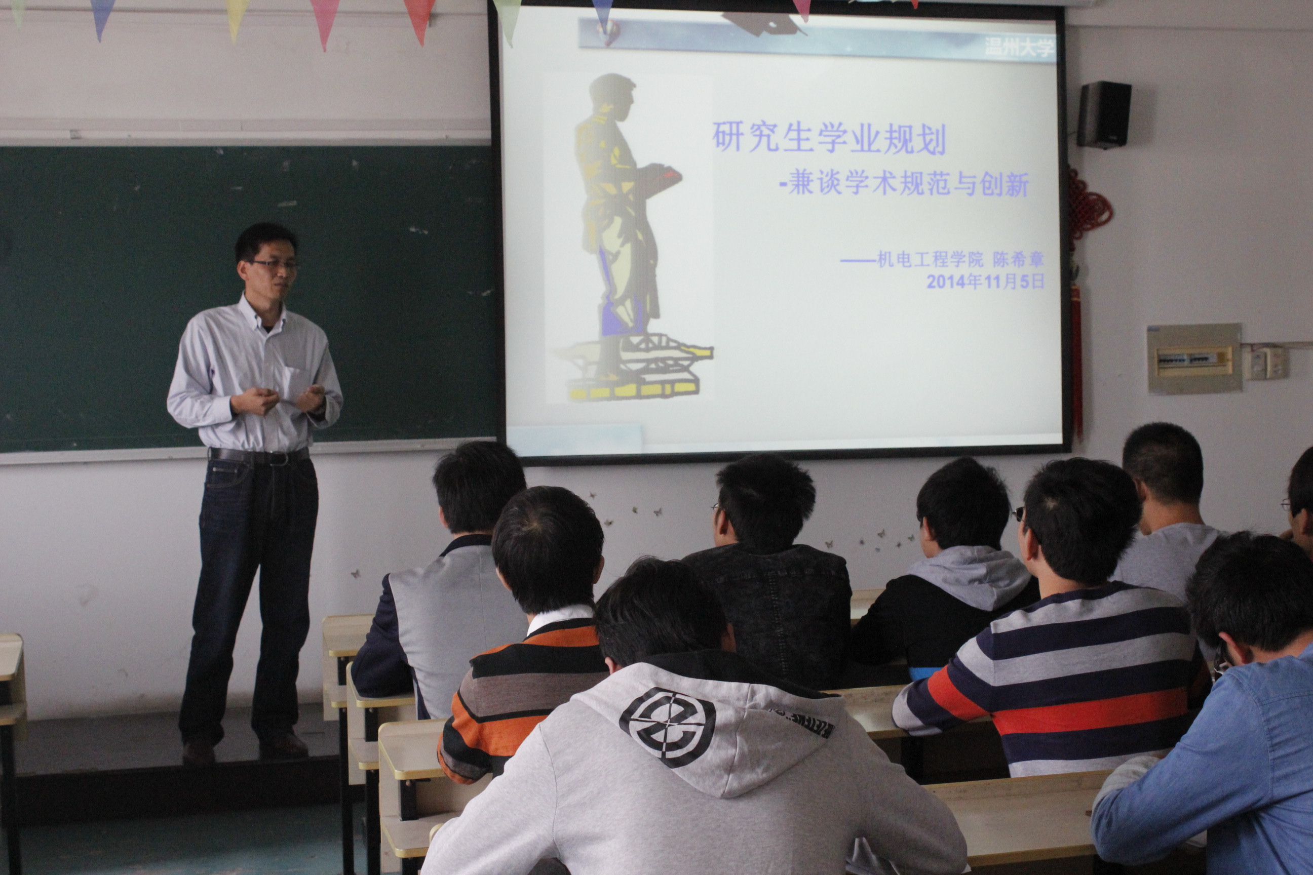 2014年11月7日,加拿大28预测 组织的以“研究生学业规划——兼谈学术规范与创新”为主题的讲座在6-B510举行。本次讲座特邀中国焊接学会机器人与自动化专委会委员、中国机械工程学会高级会员、美国焊接学会会员、加拿大28预测 硕士生导师陈希章副教授为我院2014级研究生新生“现身说法学术研究”。