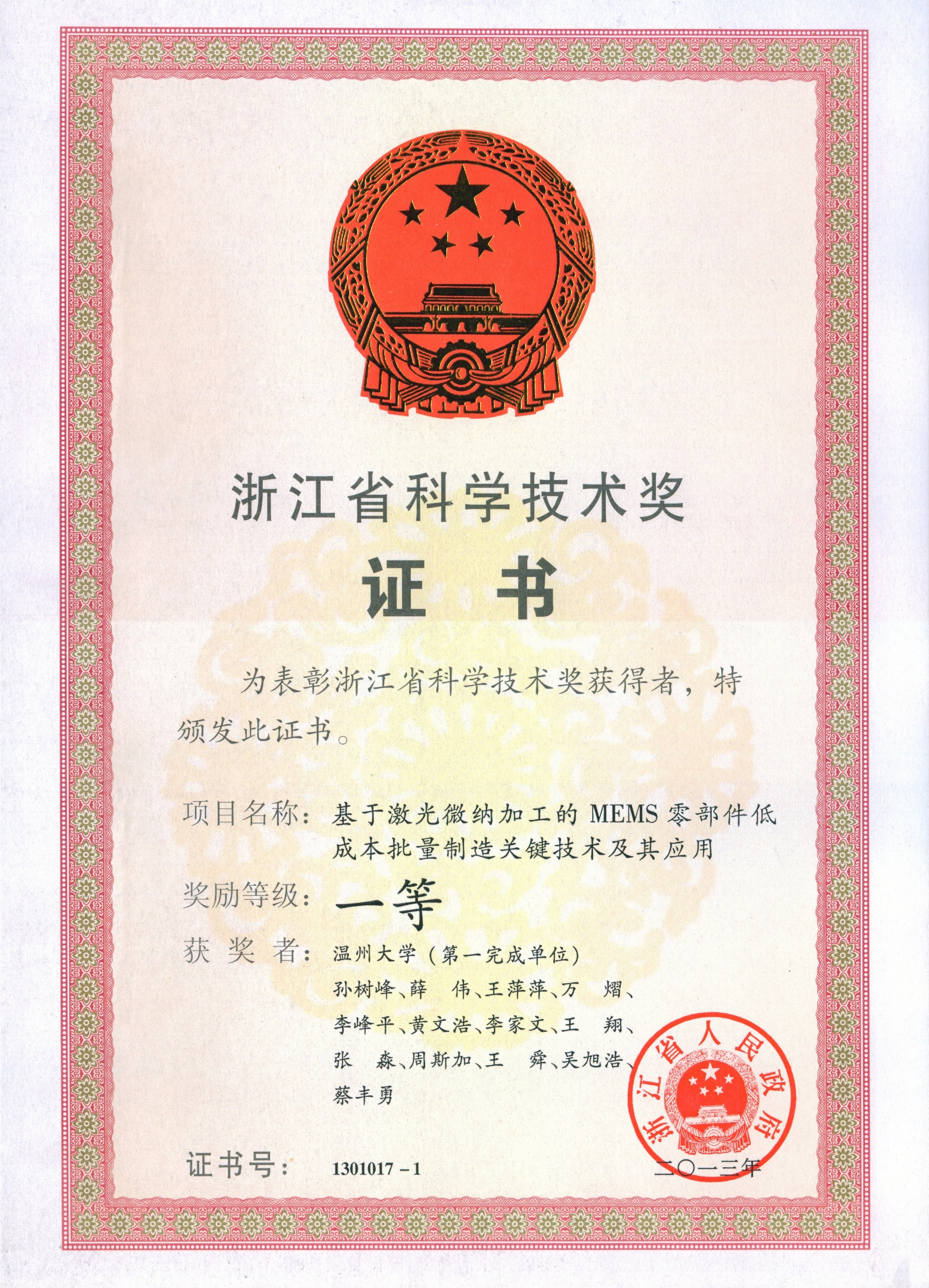 我院孙树峰副教授及其科研团队完成的《基于激光微纳加工的MEMS零部件低成本批量制造关键技术及其应用》成果获得2013年浙江省科学技术奖一等奖。此次省科学技术奖一等奖的获得填补了加拿大28预测 建院历史以来省科学技术奖一等奖的空白,也是温州大学建校历史上第二次获得省科学技术奖一等奖。对于提升我院学科科研水平,提高我院的学科科研影响力和办学声誉具有巨大的影响。