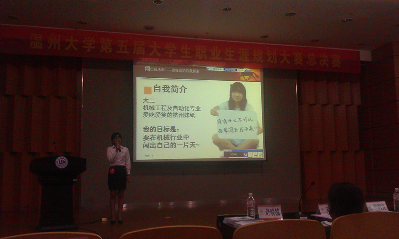 大学生职业生涯规划大赛由温州大学就业处主办,面向在校学生,以"普及规划知识,提升职业能力"为宗旨,分为职业规划与创业规划两个模块的比赛,评出"十佳职业规划之星"荣誉称号。 此次大赛从上个学期末启动以来,经过初选、复赛,最后14位优秀的选手进入总决赛。总决赛分为PPT规划作品展示、职业角色模拟和现场答辩等三个环节。我院张菲同学以作品《闯出我未来》,一名女机械销售工程师的职业定位,参加职业规划类比赛。在观众热烈的掌声中,她以对职业探索的深刻分析,对成长之路的准确规划,对大赛主题的完美陈述,对评委提问的灵活应变,大方得体的仪表,流畅精炼的谈吐等优点赢得了评委和在场观众的好评,最终以优异的成绩获得了"十佳职业规划之星"的荣誉。