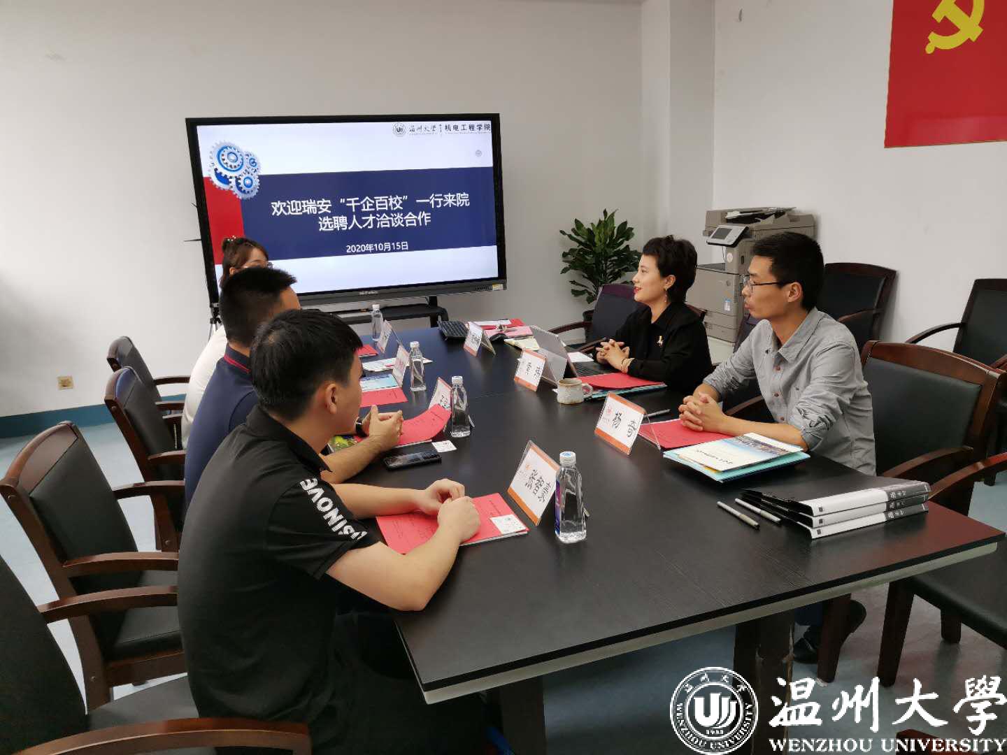 2020年10月15日,浙江润泰自动化科技有限公司方顺波总经理、方一帆经理,温州彬济人力资源有限公司王学杰总经理、张智豪助理一行4人来访我院进行校企合作洽谈,加拿大28预测 党委副书记黄玮、学工办负责人杨奇、辅导员颜孙艇参加洽谈会。
