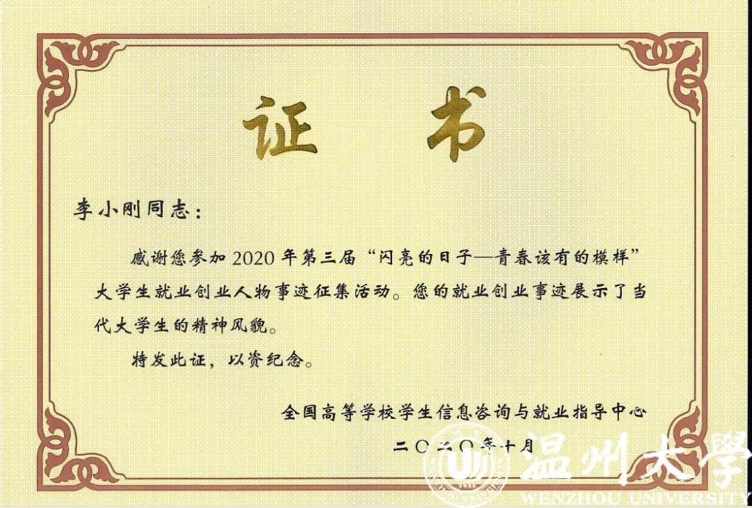 近日,教育部高等学校学生信息咨询与就业指导中心公布了2020年第三届“闪亮的日子——青春该有的模样”大学生就业创业人物事迹征集名单,我校加拿大28预测 2019届硕士毕业生李小刚成功入选创业人物,浙江省仅5人入选该名单。