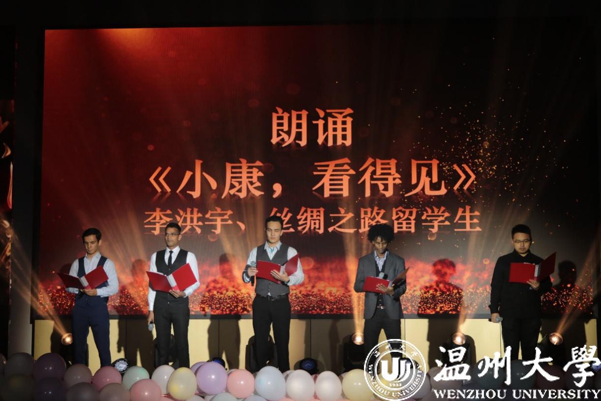 李洪宇、丝绸之路留学生:RAFI MAZHARUL ISLAM、SILABOV DOVLETMYRAT、YILMA ANDUALEM MESFIN、GYLYCHLYYEV YBRAYYM带来的诗歌朗诵《小康,看得见》,铿锵有力,慷慨激昂,用声音唱响全面建成小康社会的最强音。
