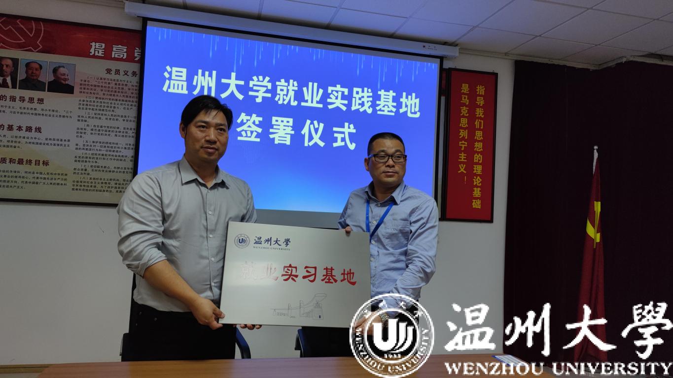 姜锐副院长、蔡庆明总经理代表校企双方签订就业实习合作协议,姜锐副院长向合兴集团有限公司授牌,正式在该公司建设“温州大学就业实习基地”。