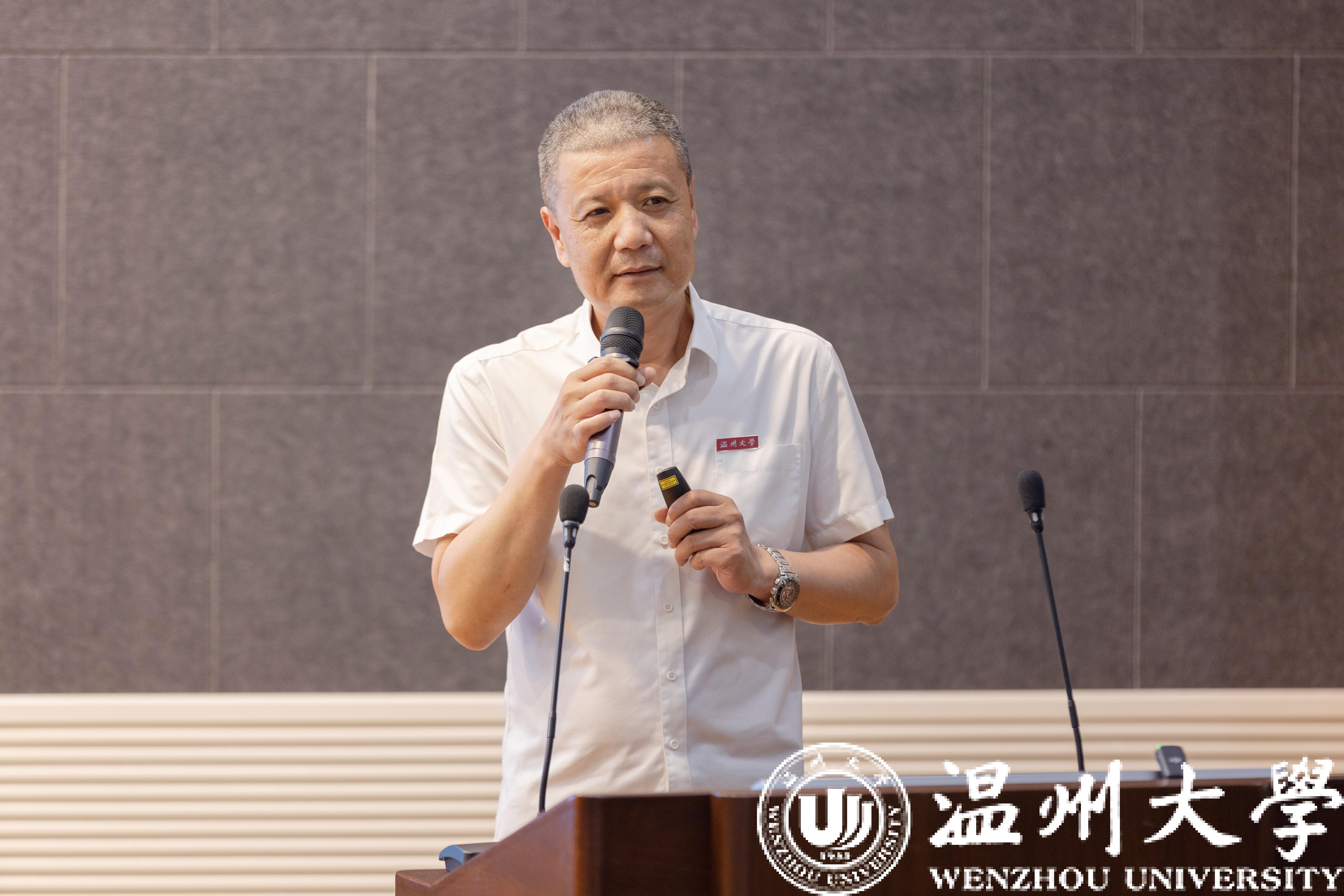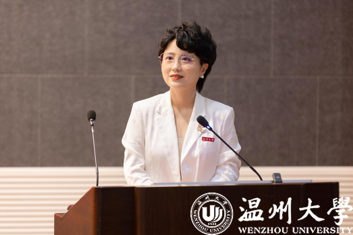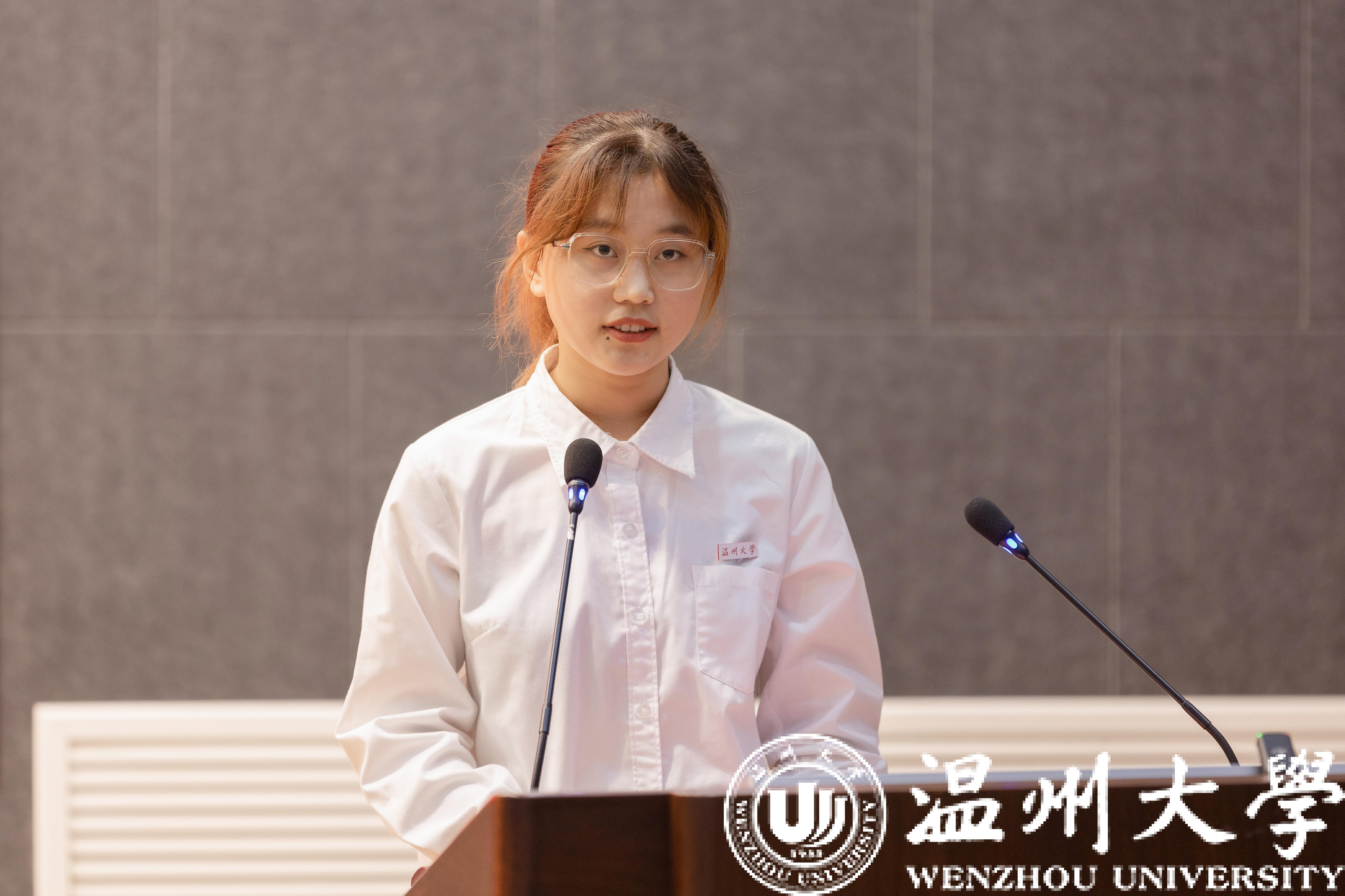 郭剑老师作为新生班班主任代表上台发言,指出同学们要培养面对挫折的能力、处理好同学之间的关系,以及博览群书、博采众长。最后,郭剑老师祝福所有同学在温州大学积累到真才实学。
