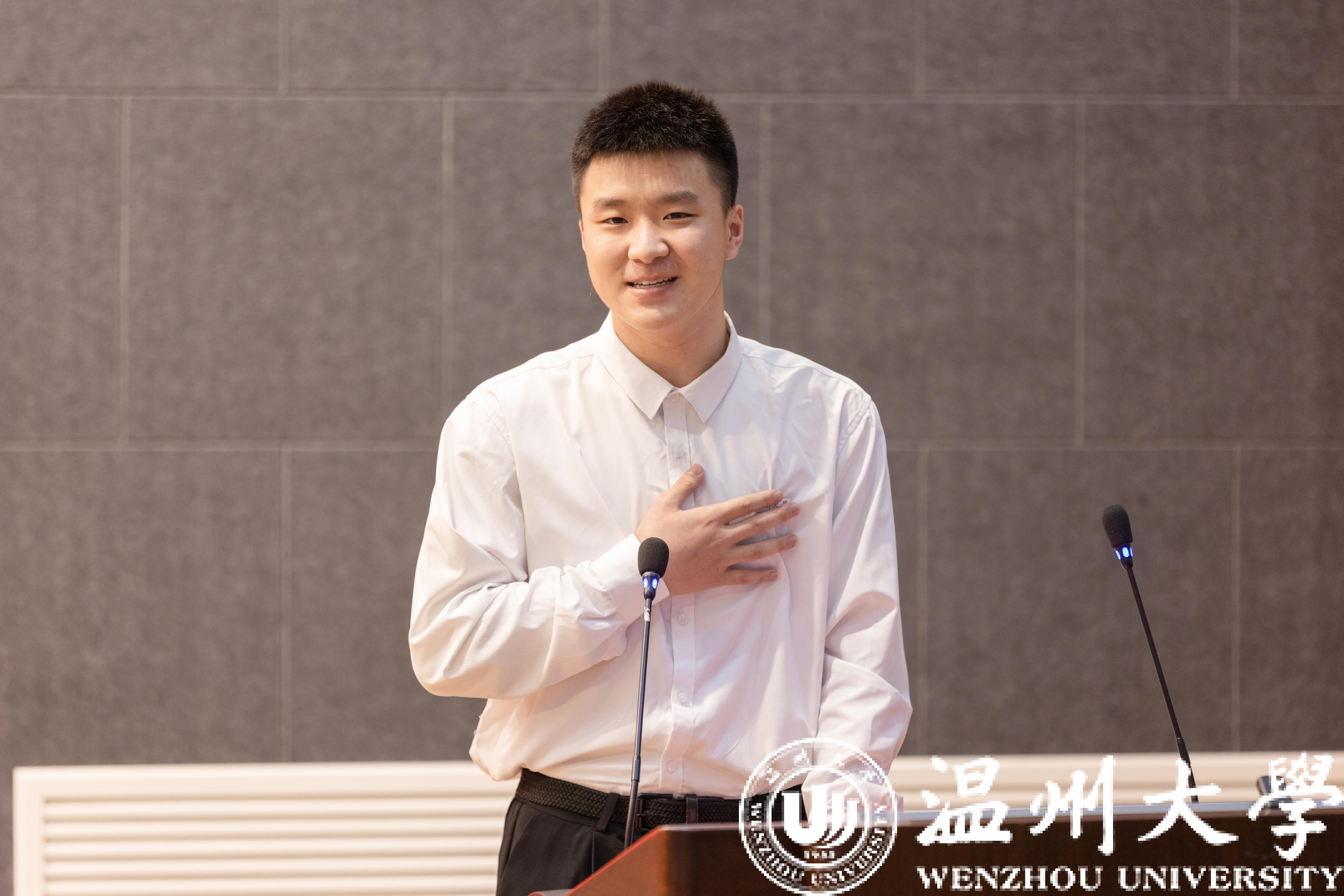 新生代表刘耀华上台发言,首先感谢了远在家乡的父母,其次表示很幸福能成为一名温州大学的学生,最后表示一定会把学习作为第一要务、作为一种内在需求、一种生活状态、一种社会责任。