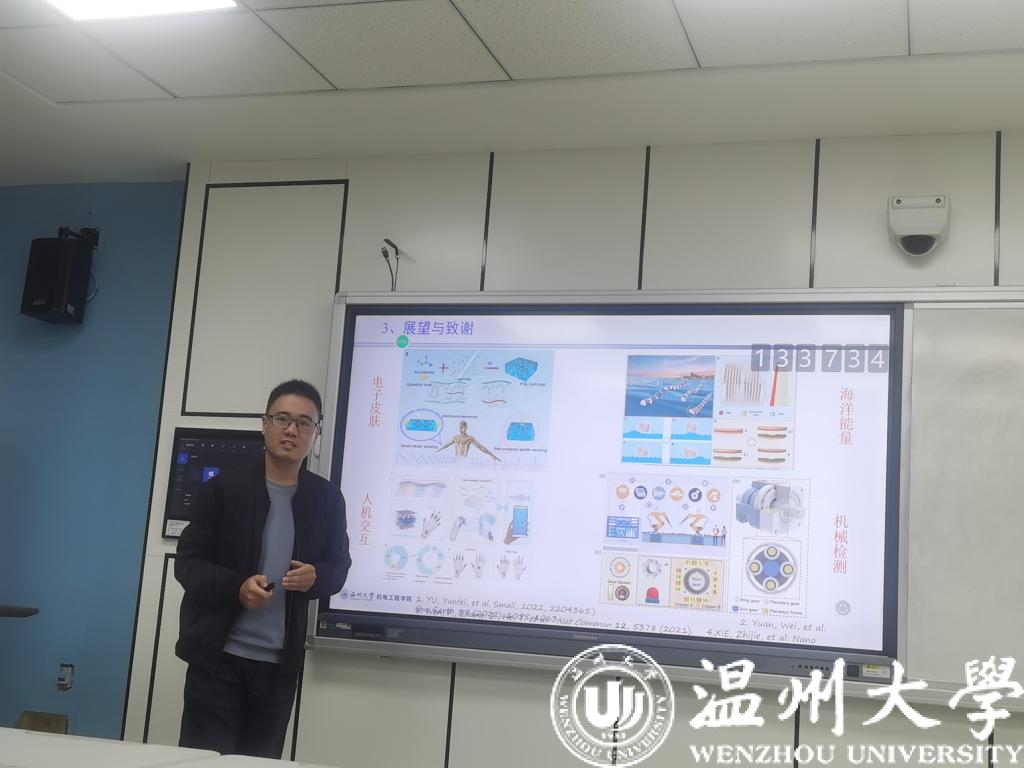 李桂钟博士的报告题目为“基于摩擦纳米发电机的自供电传感器系统的应用及发展”,他简单的介绍了实验原理与实验装置,该装置需要大量的传感器。并简述了其应用,并表示应用前景广泛。
