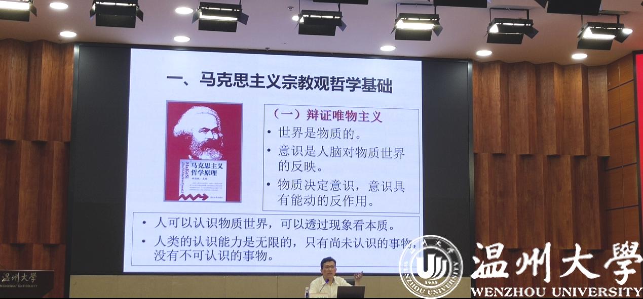 第一场讲座由王书记主讲《马克思主义宗教观》。首先,王书记分析了当今世界各地宗教的分布情况,介绍了二十一世纪宗教的发展趋势以及当前我国的宗教工作形势。重点讲解了马克思主义宗教观的哲学基础、基本内容和马克思主义宗教观中国化的变化发展。人创造了宗教,而不是宗教创造了人,它是那些还没有获得自己或是再度丧失了自己的人的自我意识和自我感觉。习近平总书记强调,宗教工作具有特殊重要性,积极引导宗教与社会主义社会相适应,坚持和发展中国特色社会主义宗教理论,坚持政教分离、坚持依法管理。当代大学生要牢记不能在校园内开展任何宗教活动,共青团员、共产党员不能有任何宗教信仰 。
