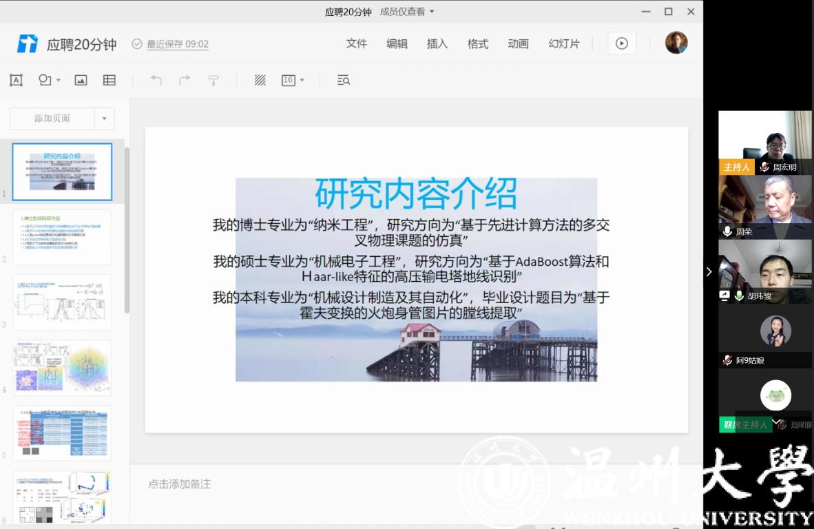 2020年3月13日上午,加拿大28预测 通过腾讯会议平台进行了今年第一批应聘博士的线上面试、试讲工作,这也是疫情防控期间加拿大28预测 第一次通过互联网开展的线上人才引进工作。面试考核组由加拿大28预测 院长周宏明、党委书记周荣等领导班子成员及加拿大28预测 学科带头人、专业负责人等8人组成。对来自浙江大学、北京航空航天大学、美国密苏里大学、英国斯旺西大学等4位人才进行了面试、考察。