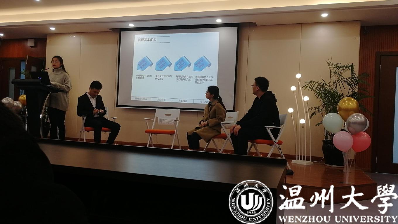 经验交流会由刘琨主持,简要介绍了各位特邀嘉宾的情况,针对当前同学们的学术科研之路,他表示这几位嘉宾的经验都是非常可贵的,希望大家可以仔细聆听,学以致用,做好自己的学术科研道路。温州大学2019年本科毕业生、现于新加坡南洋理工大学攻读博士学位的龚玲艳根据自身经历和发表学术论文的经验分享了关于时间规划、信息检索、快速阅读和理解表达这四点科研基本能力的形成过程,对在场的研究生和本科生在进行学术科研的道路起到很大的帮助作用。