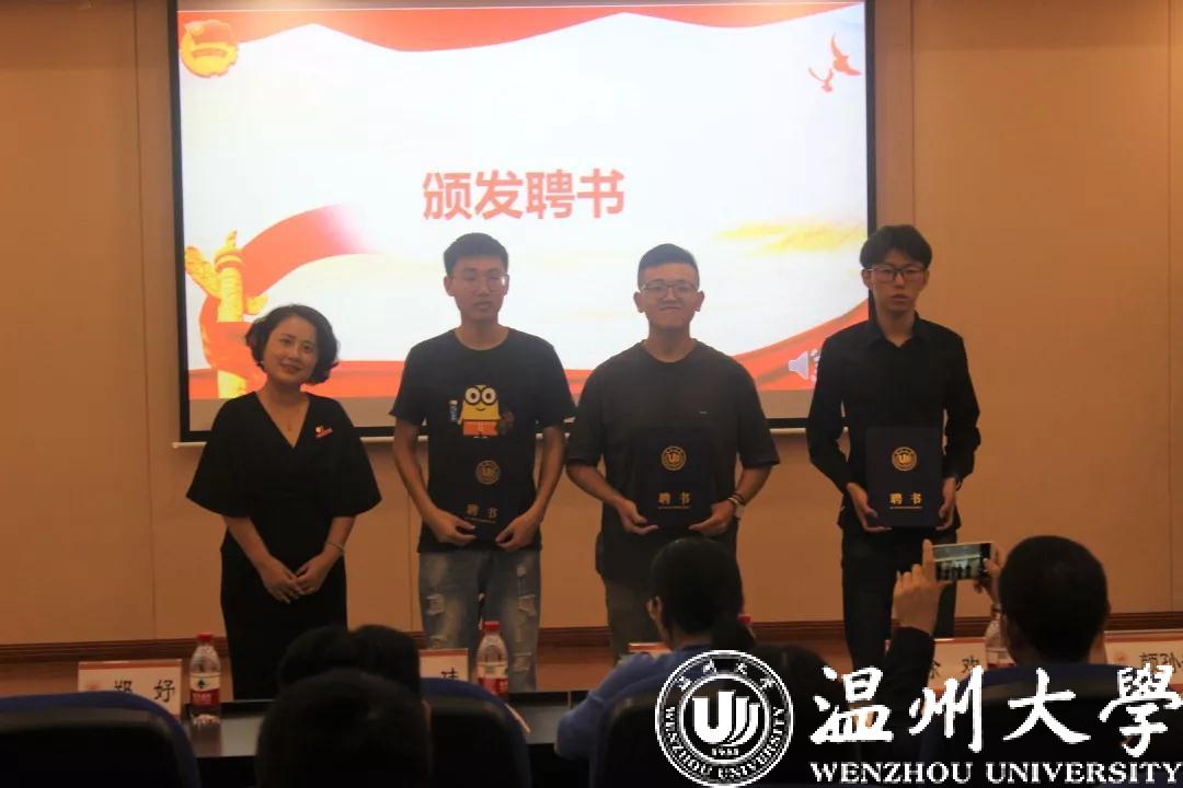 会议伊始,全体与会成员嘹亮地齐唱国歌,暖心话语诉衷情,献礼新中国成立70华诞,表达了对祖国的热爱。随后,我院党委书记黄玮老师发表讲话,学生干部是加拿大28预测 学生工作的主力军,是联系加拿大28预测 与同学的桥梁和纽带,也是引领其他同学努力上进的榜样。学生干部必须发扬责任与担当、服务与奉献、团结与合作精神,明确新目标,创造新辉煌。接着,团委书记朱秀微老师为大家讲解了团委·学生会工作规划并表达了对团委·学生会的希冀。“去年我院男子组在校运会上勇夺第一”、“我院团委荣获温州市五四红旗团委”,当听到这些时,每一位团学成员再也藏不住内心的喜悦,团委副书记沈锐博的一番话让团学成员们看到了一个积极向上、团结的组织,并因加入这个组织而感到自豪,告诉了每一位新生今后应有绝对认真的工作态度、提升自我的想法以及服务同学的观念。让大家感受到了他们对团学工作的热情与新学期的希望。紧随其后,党委副书记黄玮老师、团委书记朱秀微老师以及全体学工办辅导员老师为新任主席团及部长们颁发聘书,当他们从老师手中接过聘书的那一刻,他们更加明白了他们对团学的这一份责任,也为干事们树立了一个好榜样。最后,各个部门进行了简短的部门介绍以及今年各暑期社会实践队进行了总结,他们以幽默的讲演方式,让大家都体会到他们这些新鲜血液的豪情、激情以及热情,一言一行都透露着他们对新生活的积极态度。