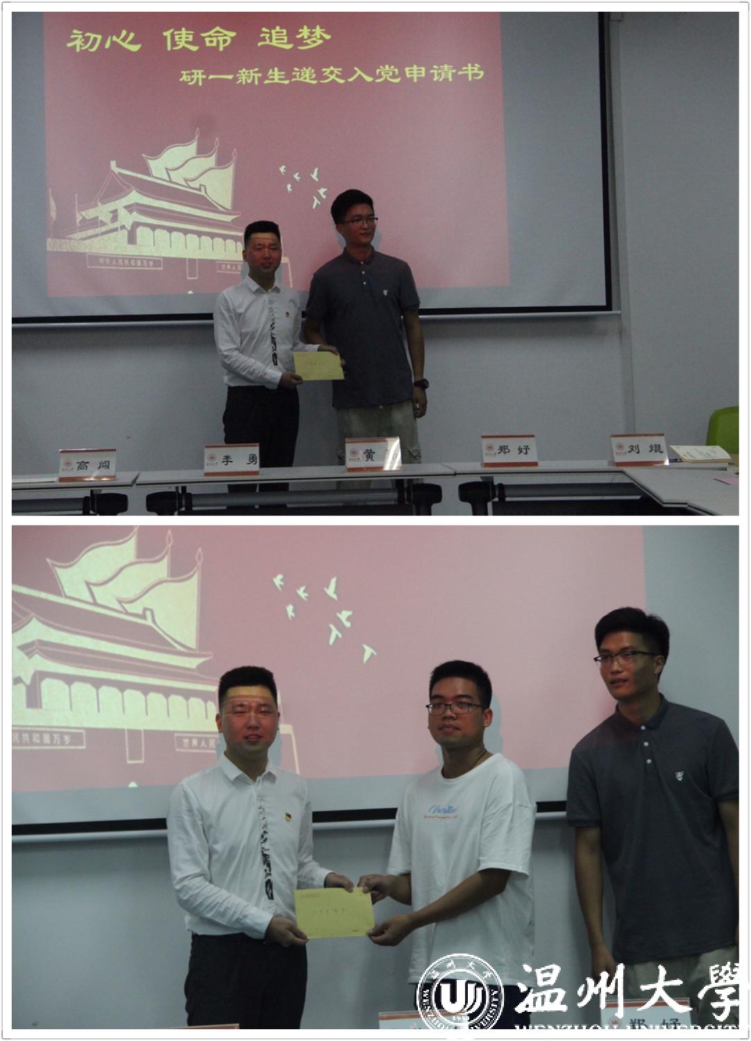 加拿大28预测 研究生党支部书记、获奖团队成员之一的刘焜同学向我们分享了自从递交入党申请书到现在成为一名党支部的书记的成长经历,他表示党员要起到先锋作用,时刻冲锋在前,一直坚持党员的标准来对照自己,此次参加比赛,困难重重,比赛方案改了又改,但最终都坚持了下来而并没有放弃,依靠的就是一份信念,而这份信念来源就是他加入中国共产党以来的成长经历。刘琨同学的分享给在场的同学们一身正气,在场的同学们更坚定了要积极向党组织靠拢的决心,研一新生黄锦森和曾麟同学在现场主动向党组织递交入党申请书,表达他们想要积极加入党组织的强烈意愿,想早日成为一名有思想有灵魂有本领的社会主义接班人。