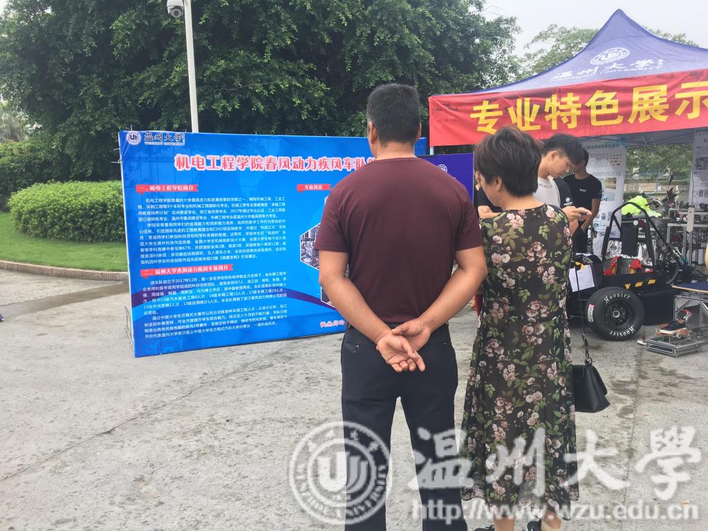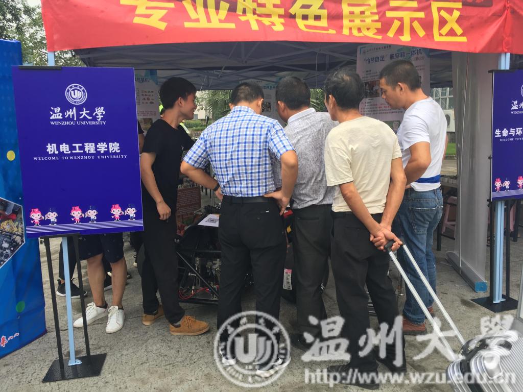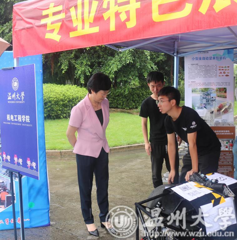 在报到处的另一侧,我院优秀学子的科技作品也吸引了许多新生及家长驻足欣赏,从他们眼中可以看出他们对那些制作出作品的优秀学子们的那一份敬佩。这其中也有我校党委书记林娟娟的身影,她愉悦地与现场的学子进行交流,脸上写满了对我院美好未来的期许。
