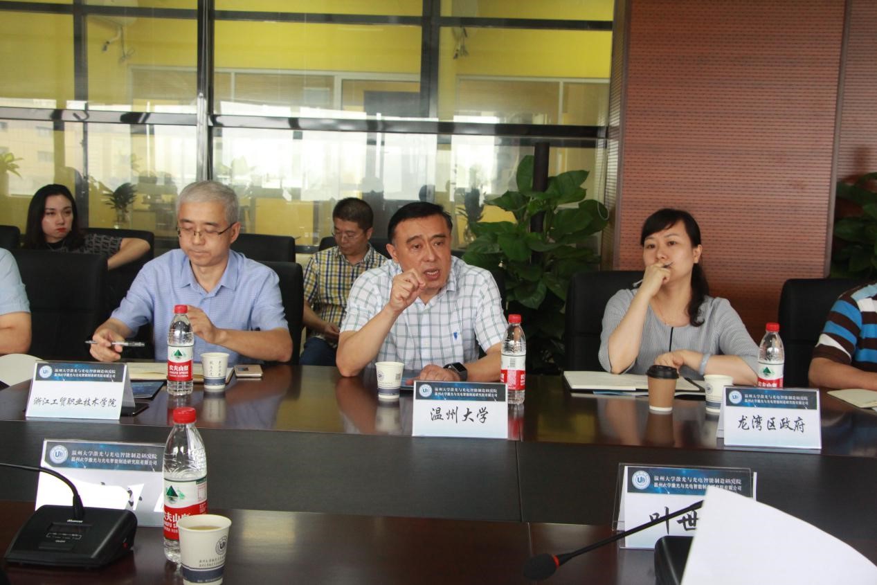 在随后举行的座谈会上,相关单位负责同志分别就产学研合作方面存在的问题和发展现状做了简要的汇报。温州大学副校长、研究院理事长薛伟介绍了温州大学激光与光电智能制造研究院的运行机制、定位和发展目标。研究院常务副院长李峰平重点介绍了研究院在体制创新、产学研结合和服务地方经济等层面的建设情况和取得的成绩。